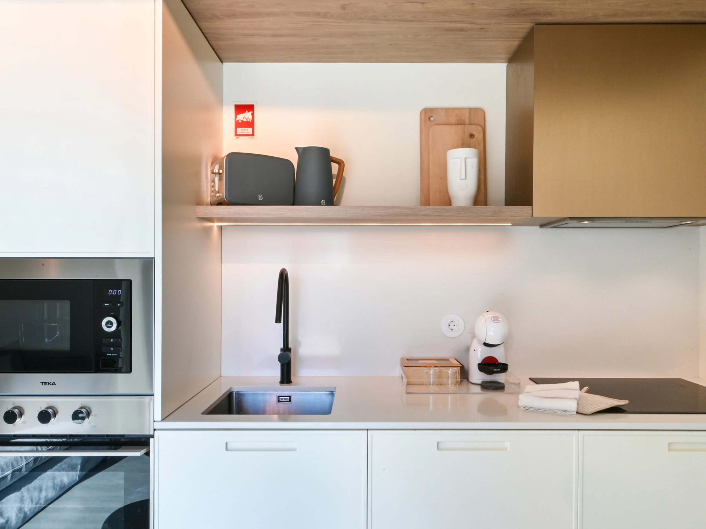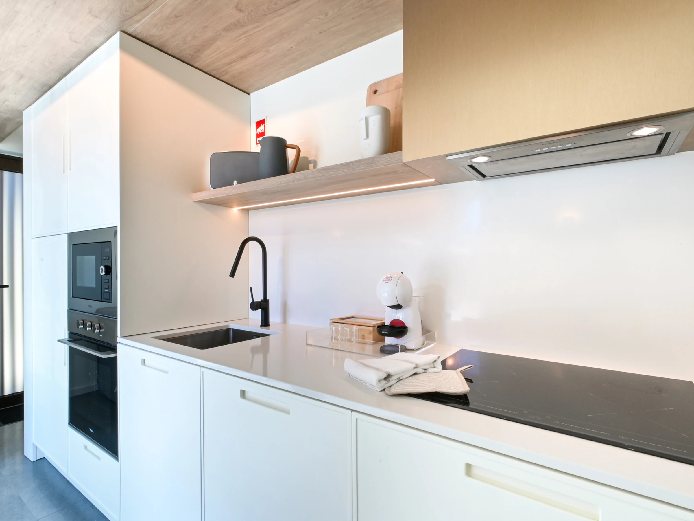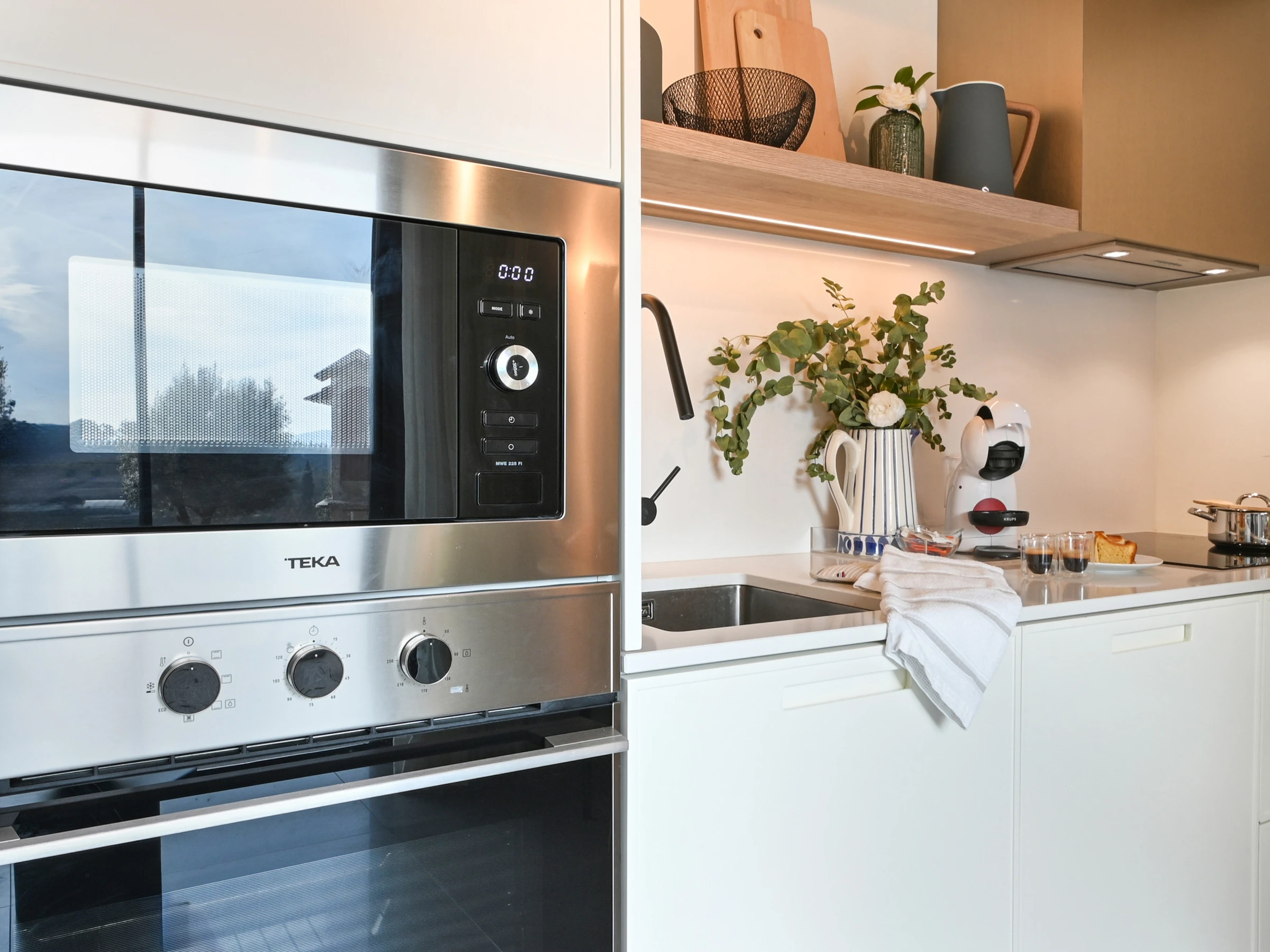La cuisine, est équipée avec réfrigérateur, micro-ondes, four, congélateur, lave-vaisselle, vaisselle/couverts, ustensiles/cuisine, cafetière, grille pain et bouilloire.