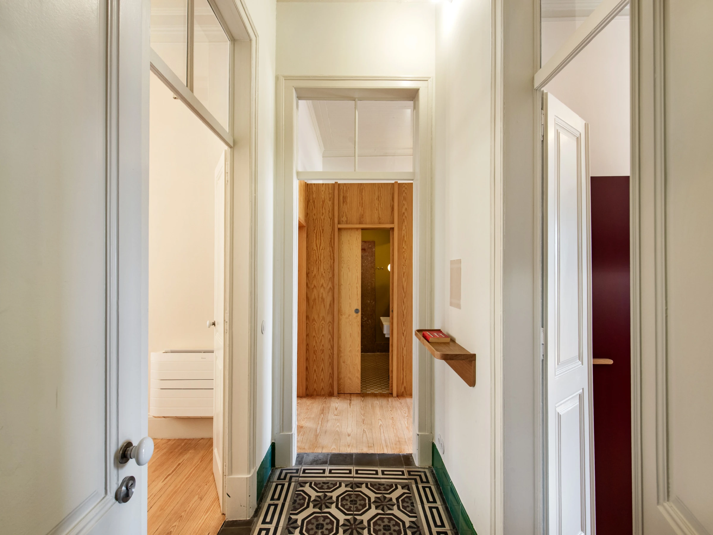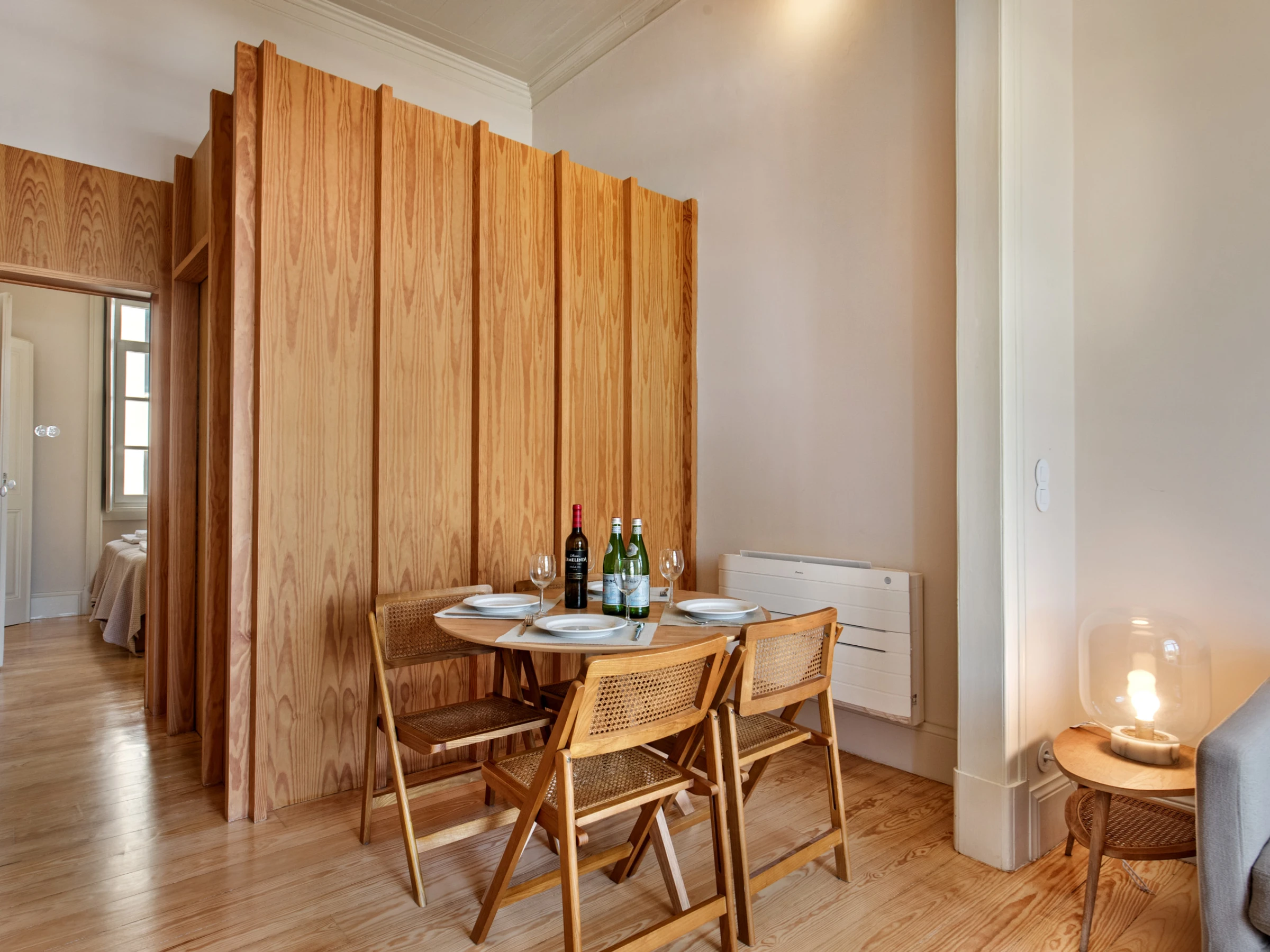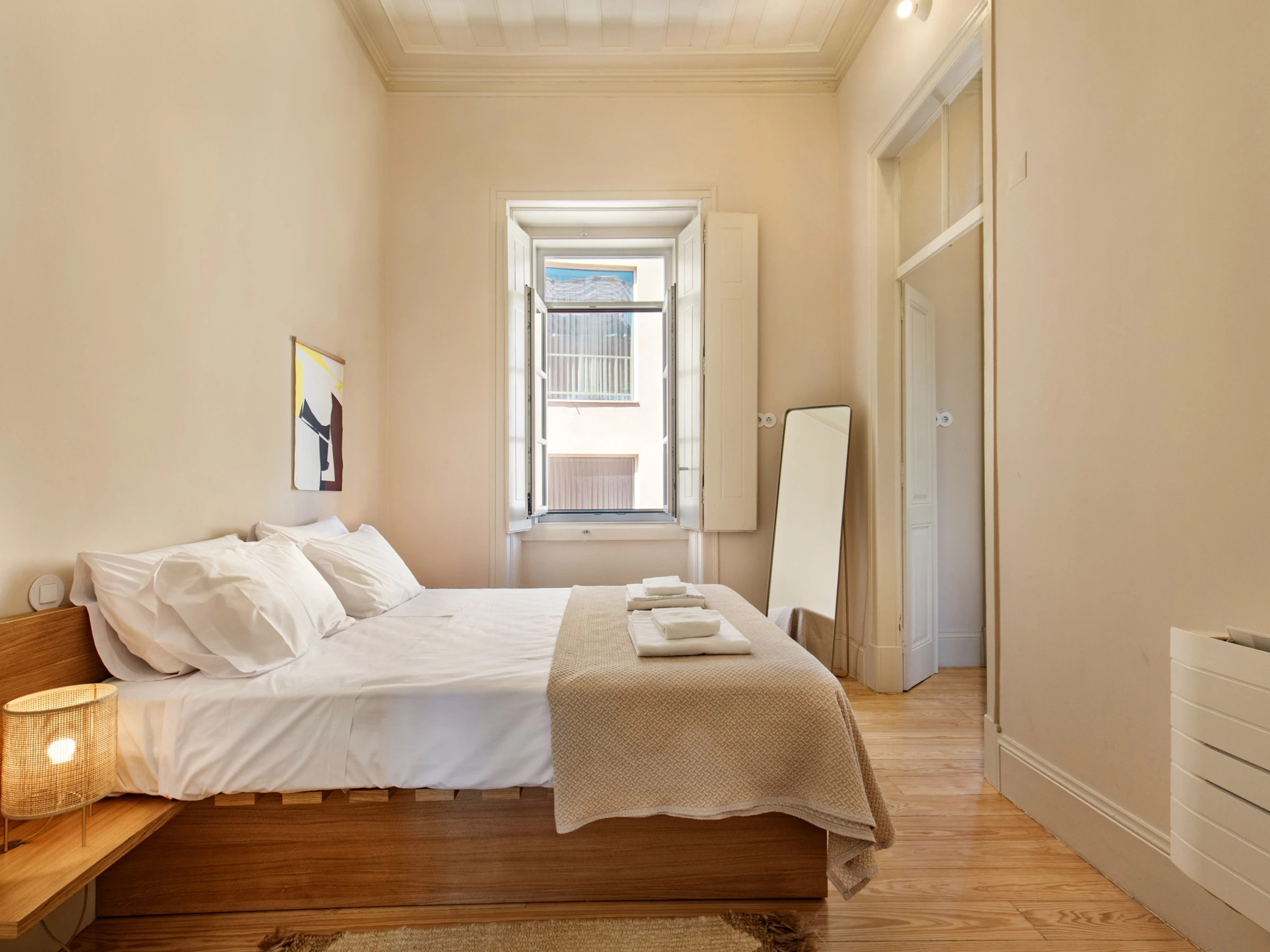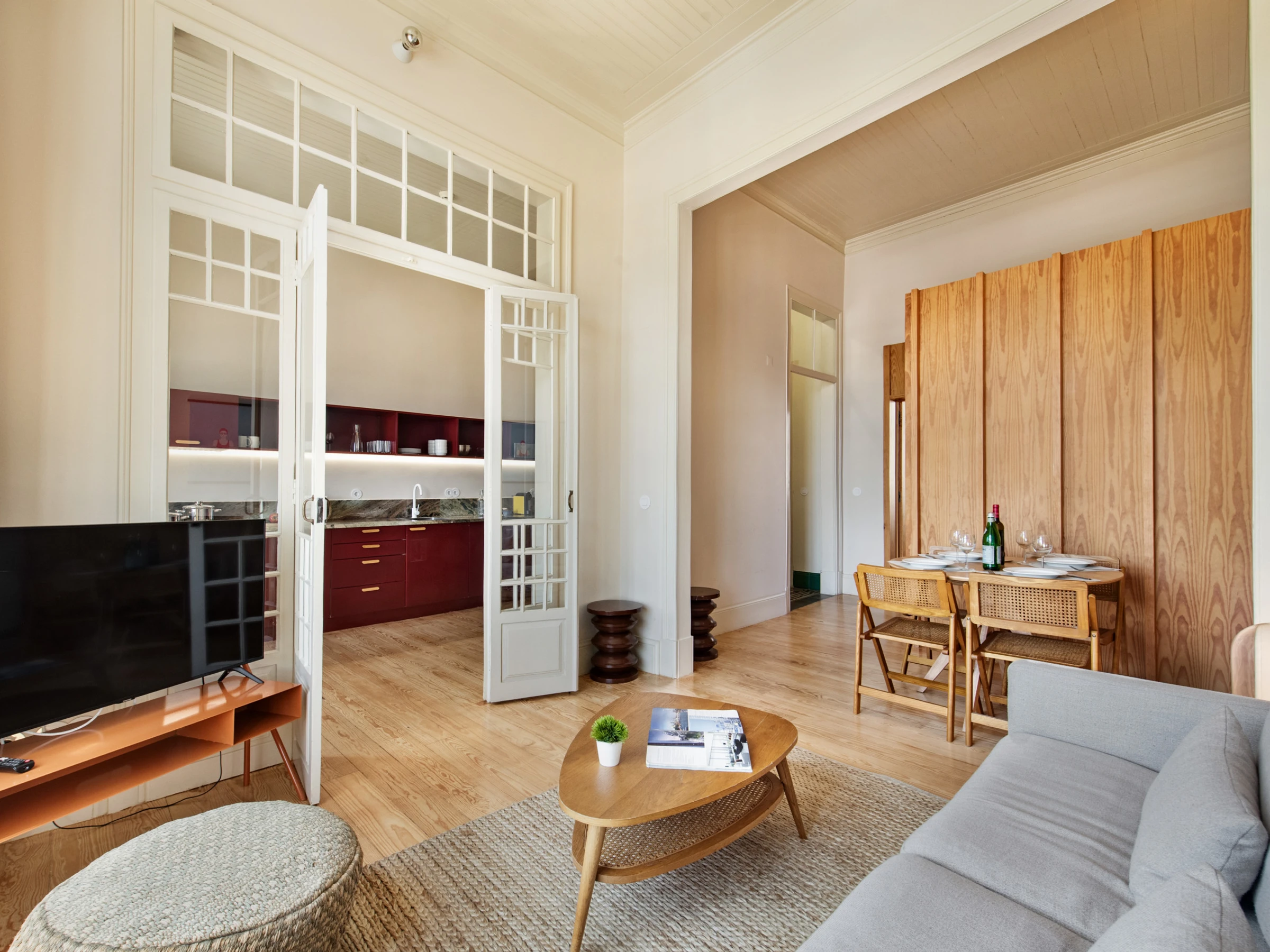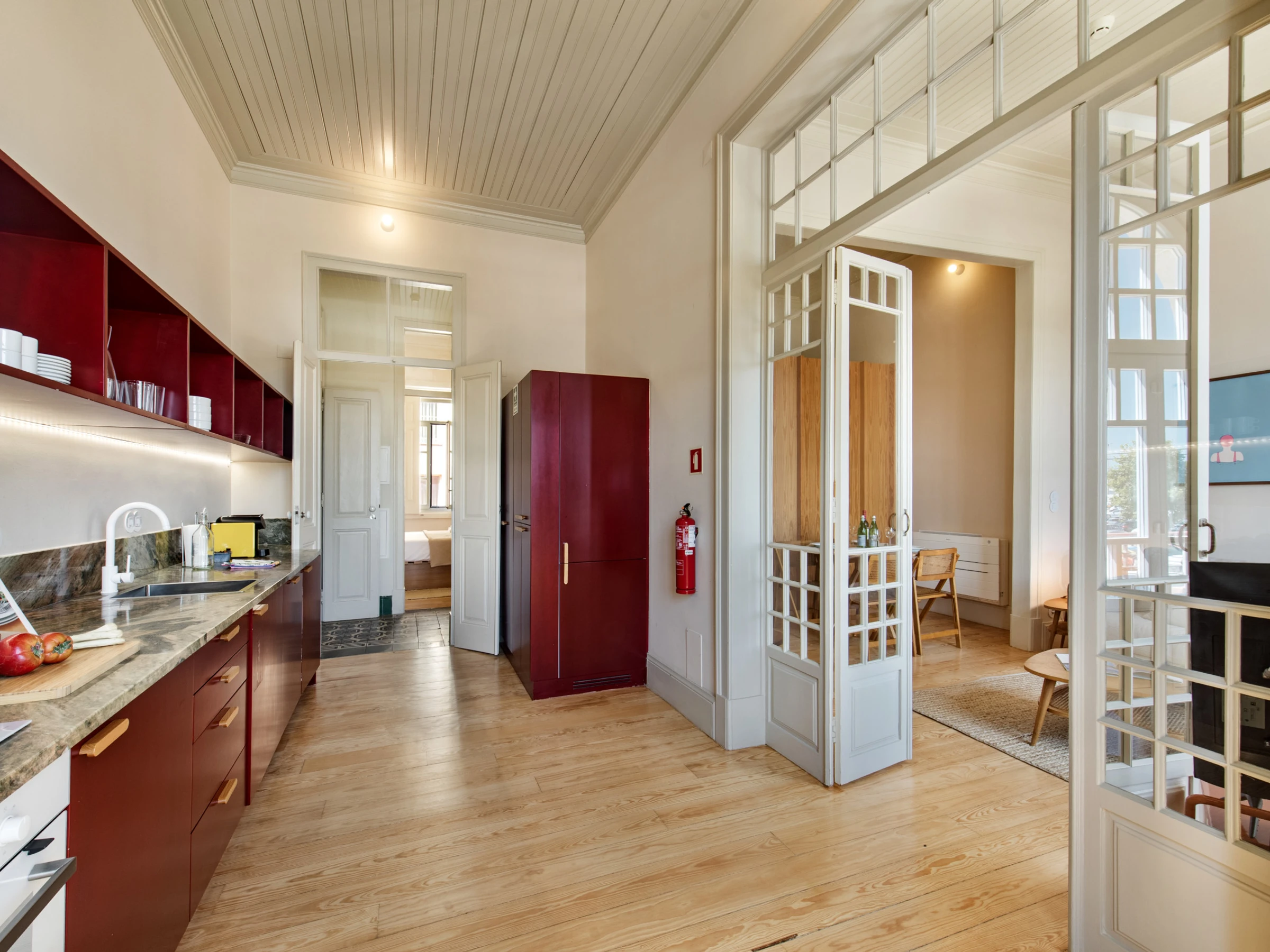 L'espace a été conçu pour surprendre : la hauteur sous plafond, les larges fenêtres en arc et le parquet en bois créent une ambiance lumineuse et élégante, où chaque détail renforce l'équilibre entre le passé et le présent. Les deux chambres invitent au repos tranquille, et l'espace de vie, avec une fenêtre donnant sur une vue, invite à profiter du temps avec légèreté et décontraction. La cuisine est entièrement équipée, parfaite tant pour des repas rapides que pour des dîners plus longs.