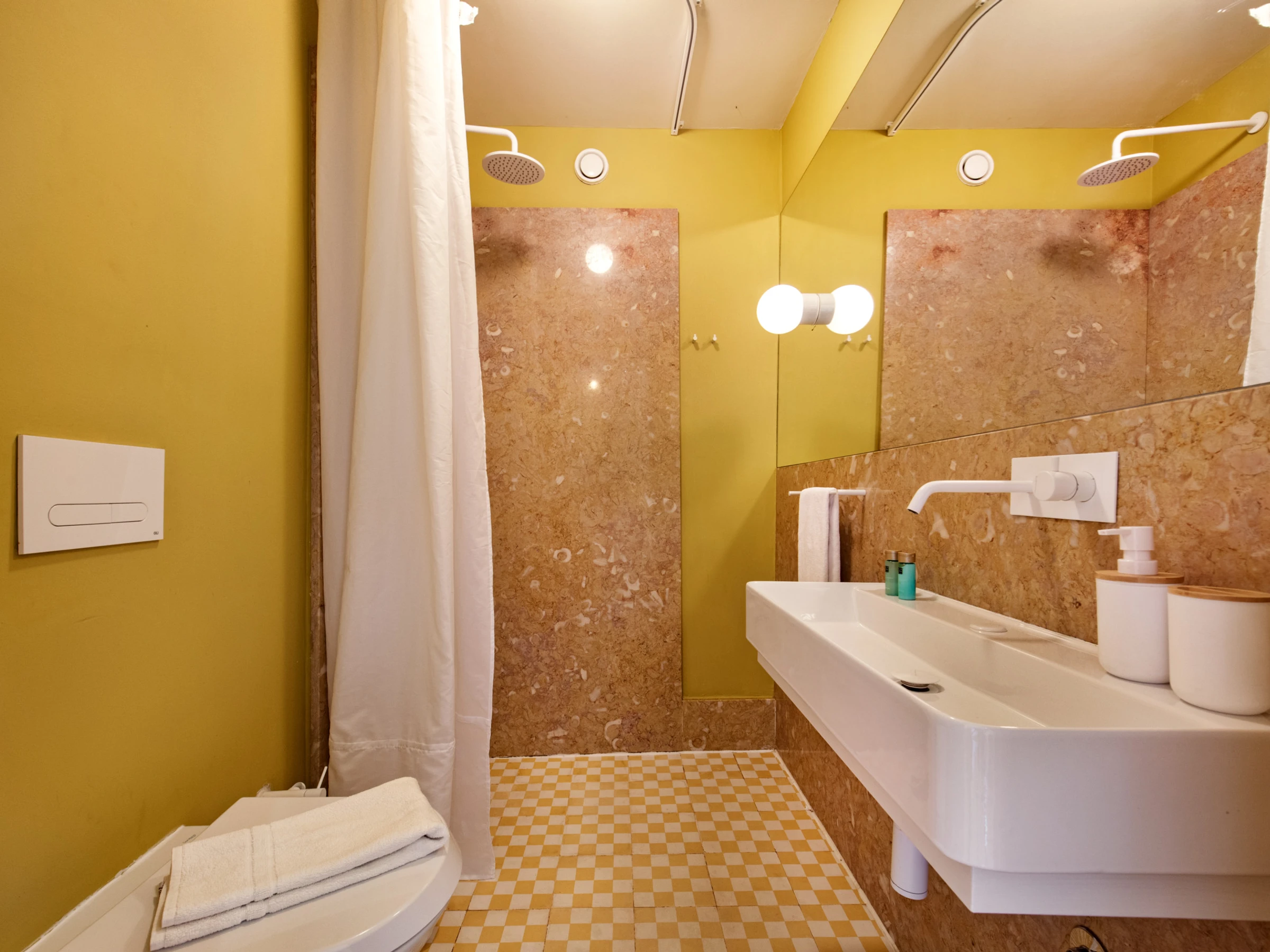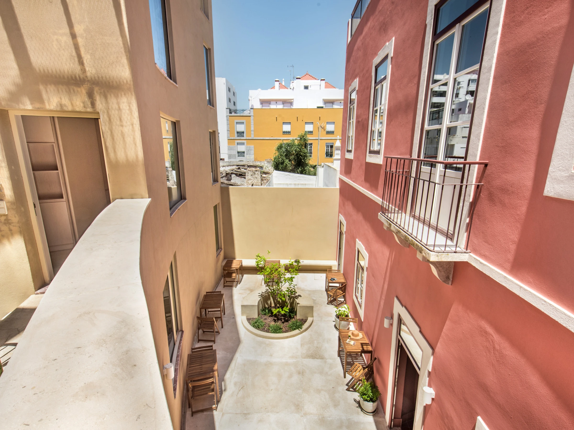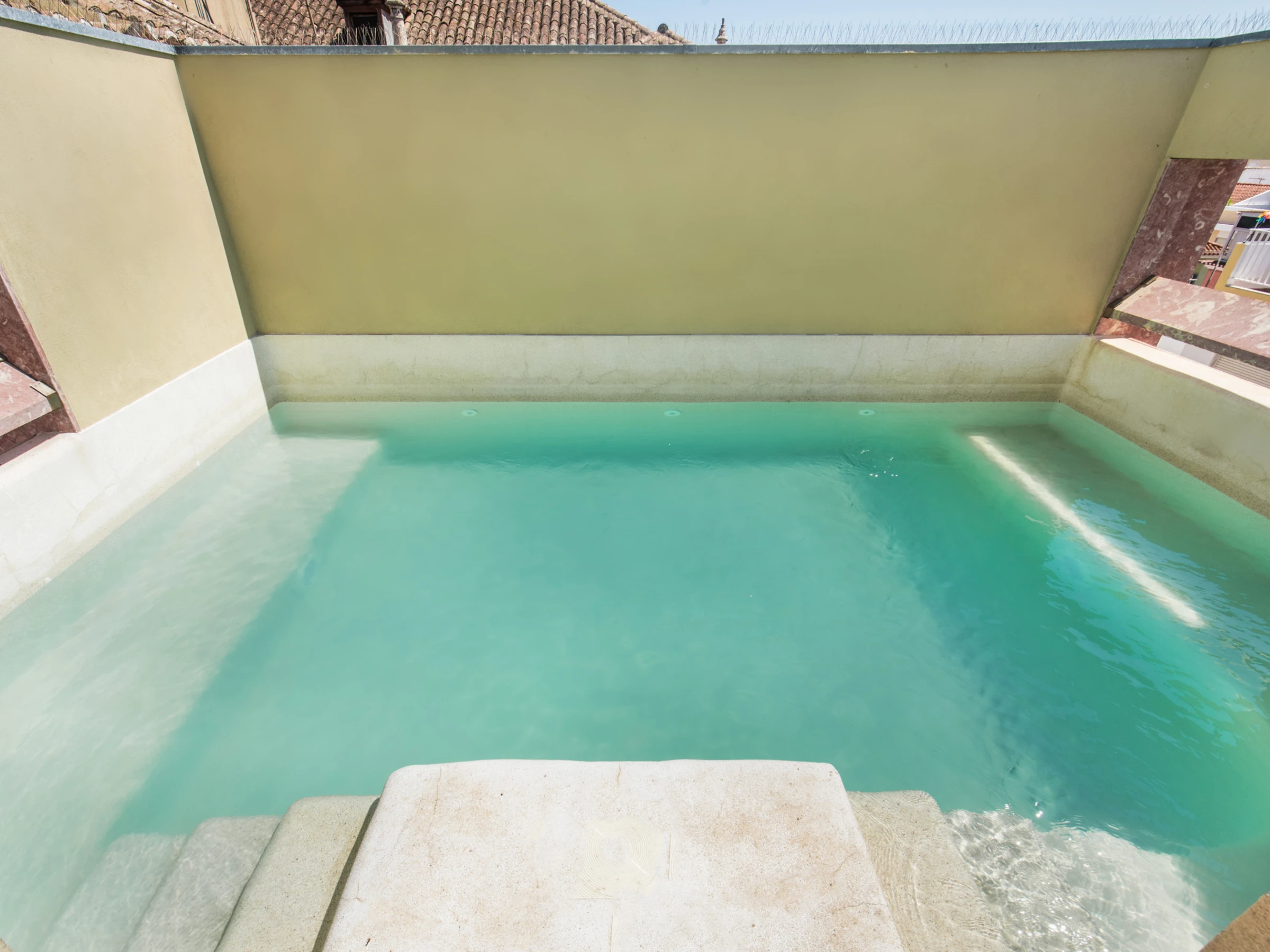 Au-delà de l'expérience intérieure, les invités ont accès à des espaces extérieurs communs et à une piscine installée au sommet du bâtiment arrière — un espace unique pour se détendre et profiter du soleil. Cependant, étant donné l'accès uniquement par des escaliers ouverts, cet espace n'est pas adapté aux invités à mobilité réduite ou aux jeunes enfants.
