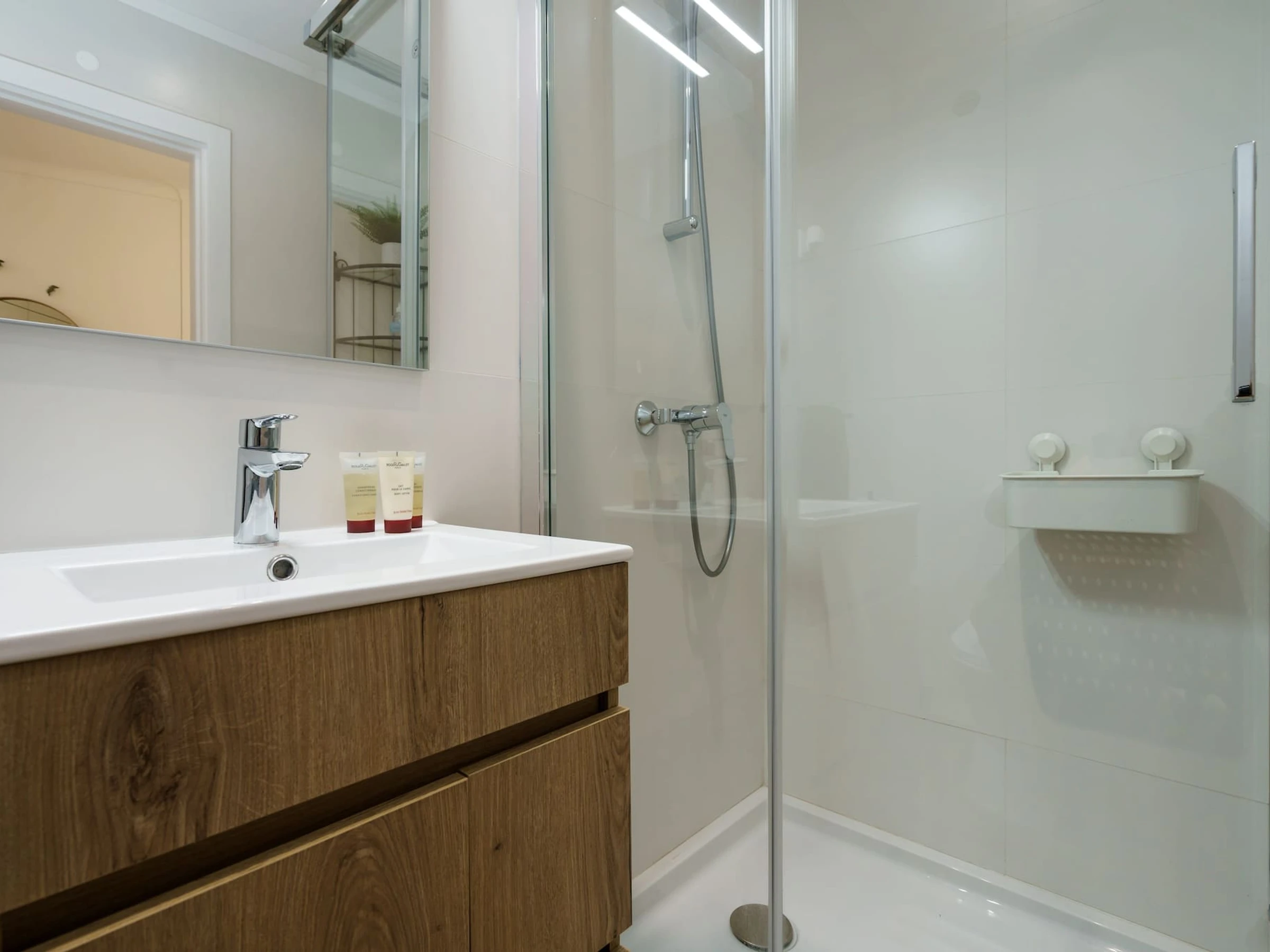 • Salle de bain : Entièrement rénovée avec une douche italienne moderne et un lave-linge.