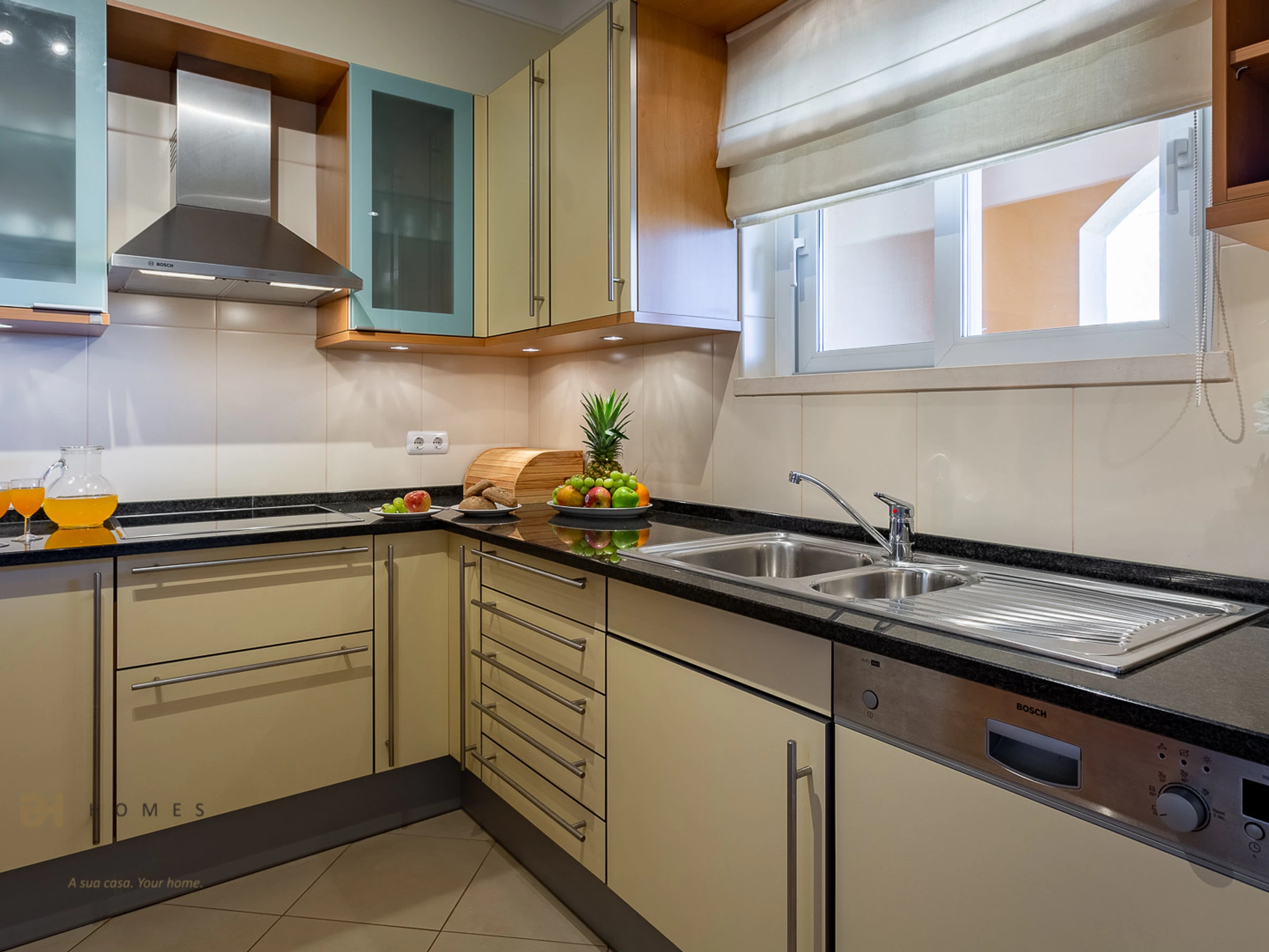 À l'intérieur, vous trouverez une cuisine entièrement équipée avec tous les essentiels, notamment une cuisinière, un réfrigérateur, un four, un lave-vaisselle et divers petits appareils électroménagers. L'espace de vie est complété par une table à manger, rendant les repas très faciles. L'appartement dispose de trois salles de bains - l'une avec une douche, l'autre avec une baignoire, et des toilettes séparées - offrant un grand confort pour les familles.