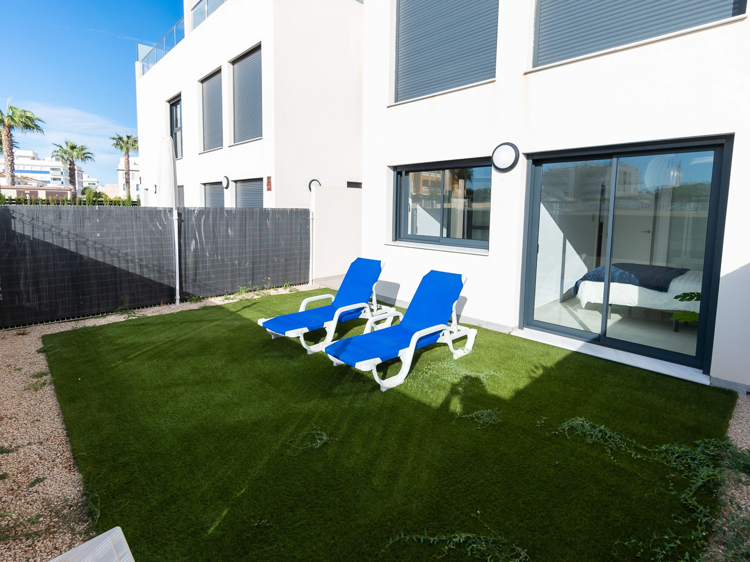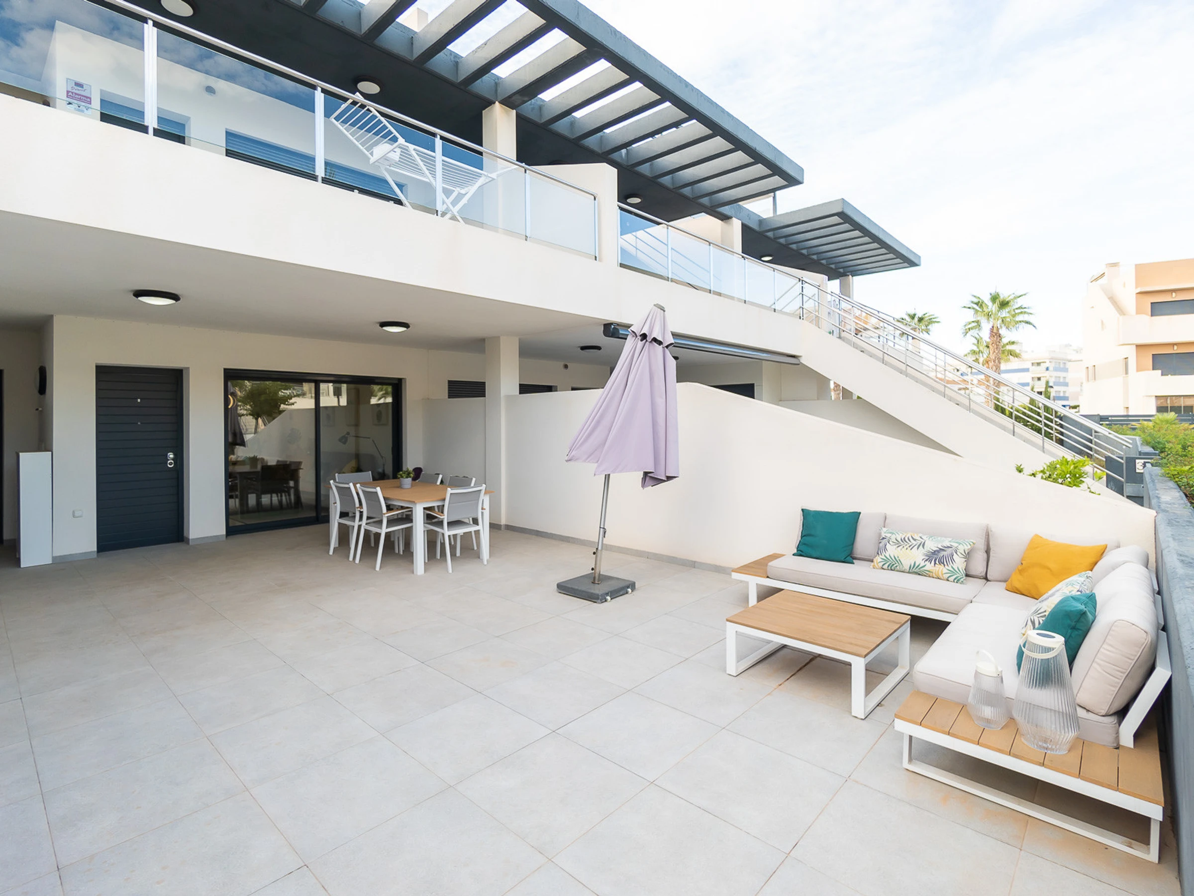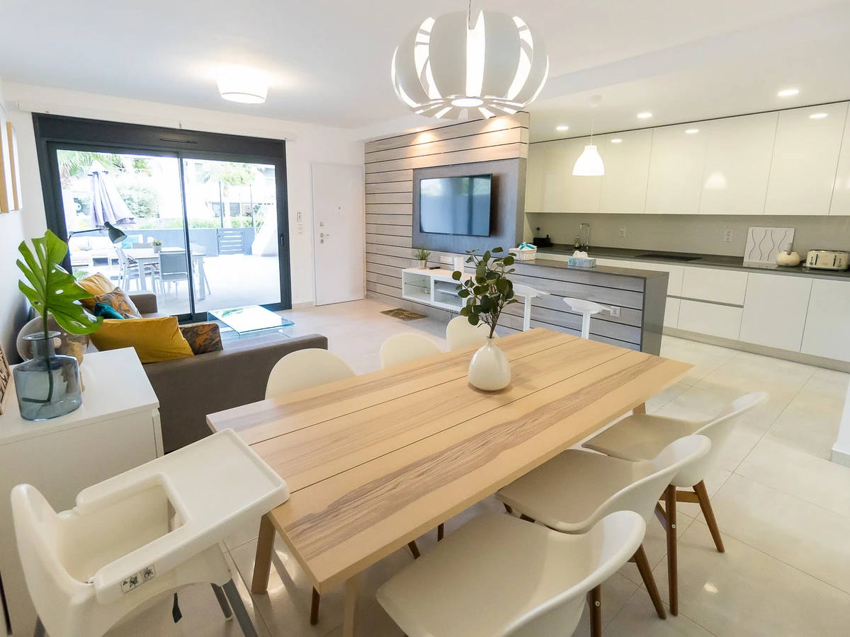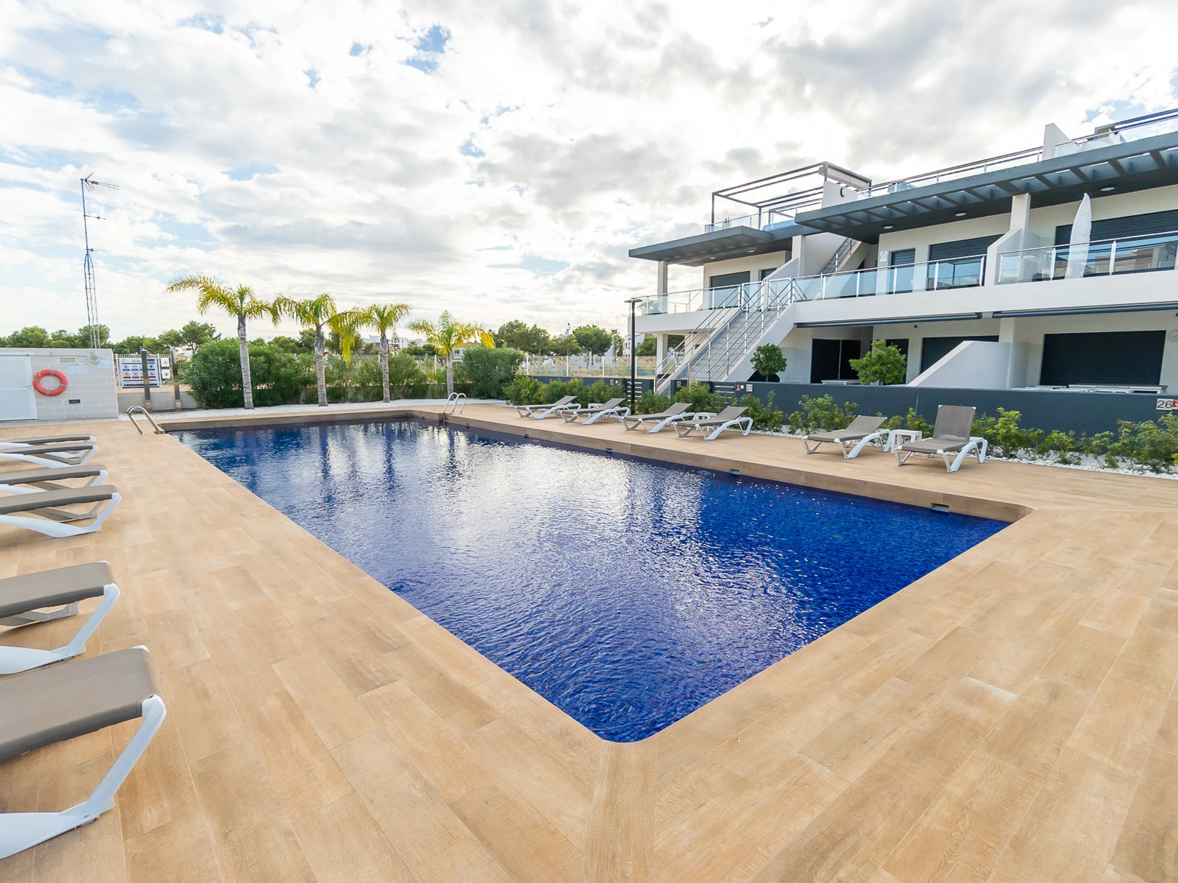 Nous vous proposons des appartements en location courte durée dans la résidence Royal Park 23. L'appartement a une superficie de 100 m2 et se compose de trois chambres, un séjour, une cuisine et deux salles de bains. Vous trouverez une terrasse privée pour bronzer, ainsi qu'une grande cour avec mobilier de jardin et barbecue. Il y a une place de parking dans le garage souterrain. Les appartements disposent de tout ce dont vous avez besoin pour un séjour confortable et relaxant : meubles, électroménager (dont une cafetière), vaisselle, linge de lit et serviettes, chaises longues. Climatisation centrale, télévision espagnole, Internet sans fil. La résidence dispose de son propre grand espace avec piscine. Non loin de la résidence se trouve un supermarché « DIAL PRIX », dans un rayon de 250 mètres se trouvent plusieurs restaurants et les golfs sont à un peu plus d'un kilomètre. La mer et la plage de La Zenia sont à environ 2,5 kilomètres. Possibilité d'hébergement – jusqu'à 6 personnes (pas d'animaux !). Il est permis de fumer uniquement dans la cour !