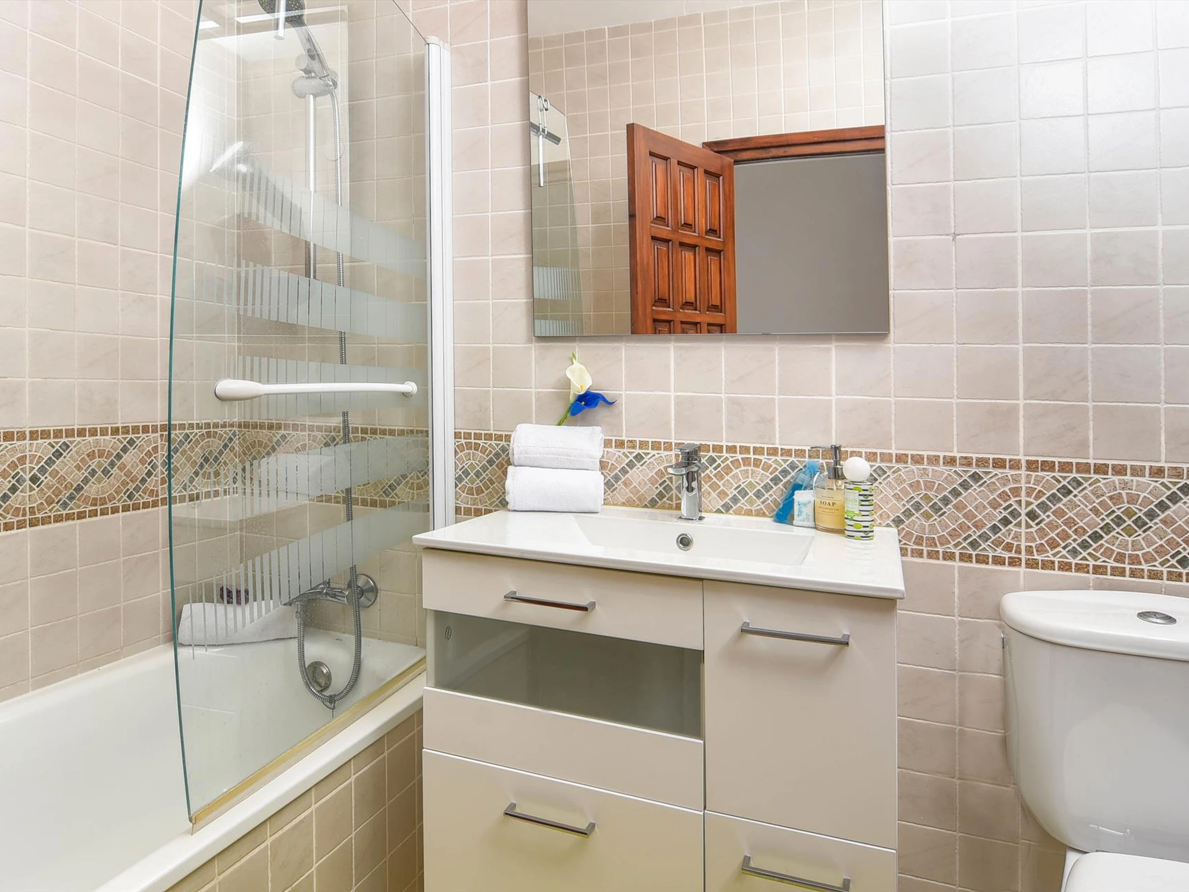 * Salle de bains attenante avec lavabo simple, baignoire/douche et toilettes