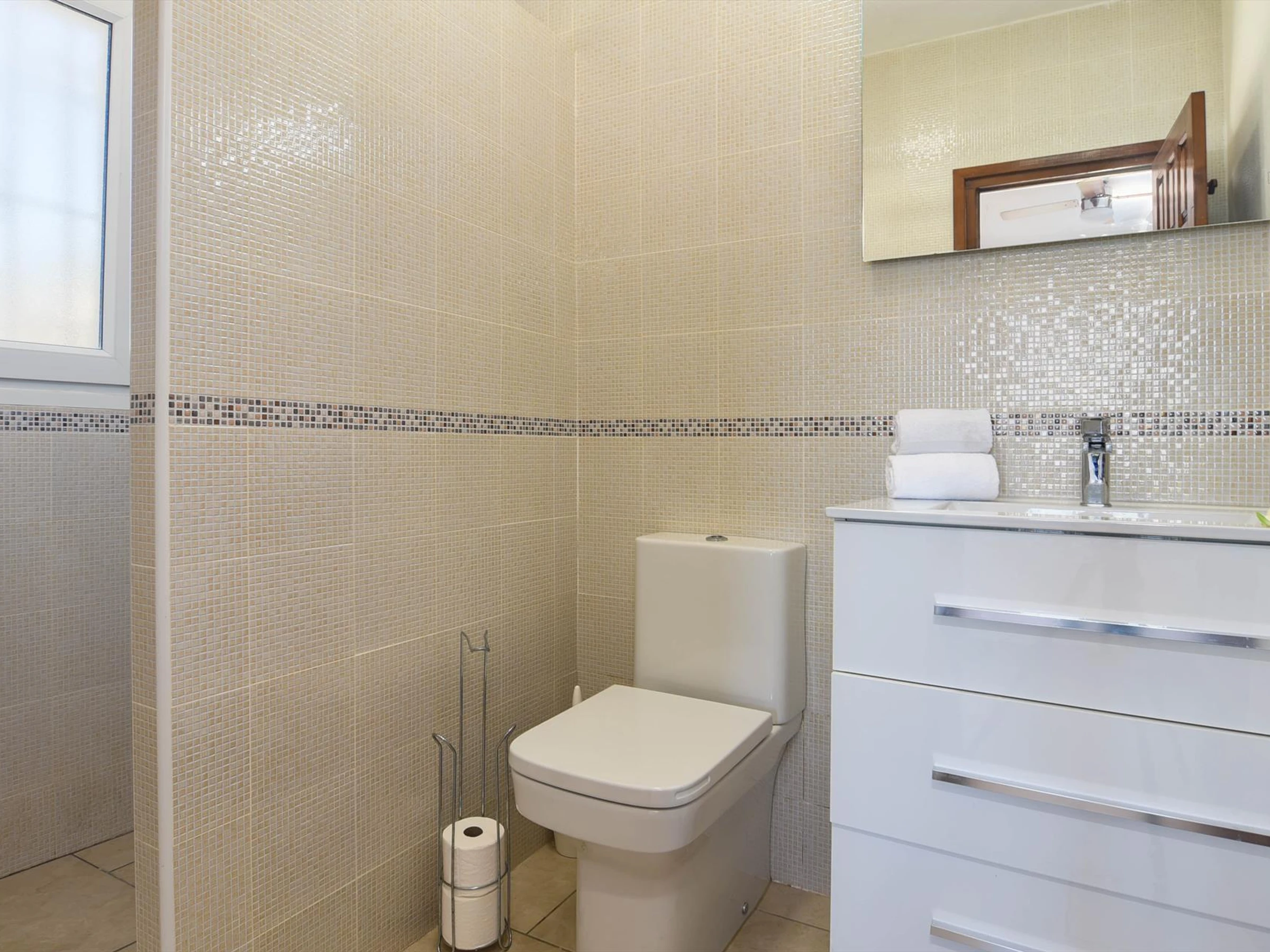 * Salle de bains avec lavabo simple, douche et toilettesExtérieur de la villa