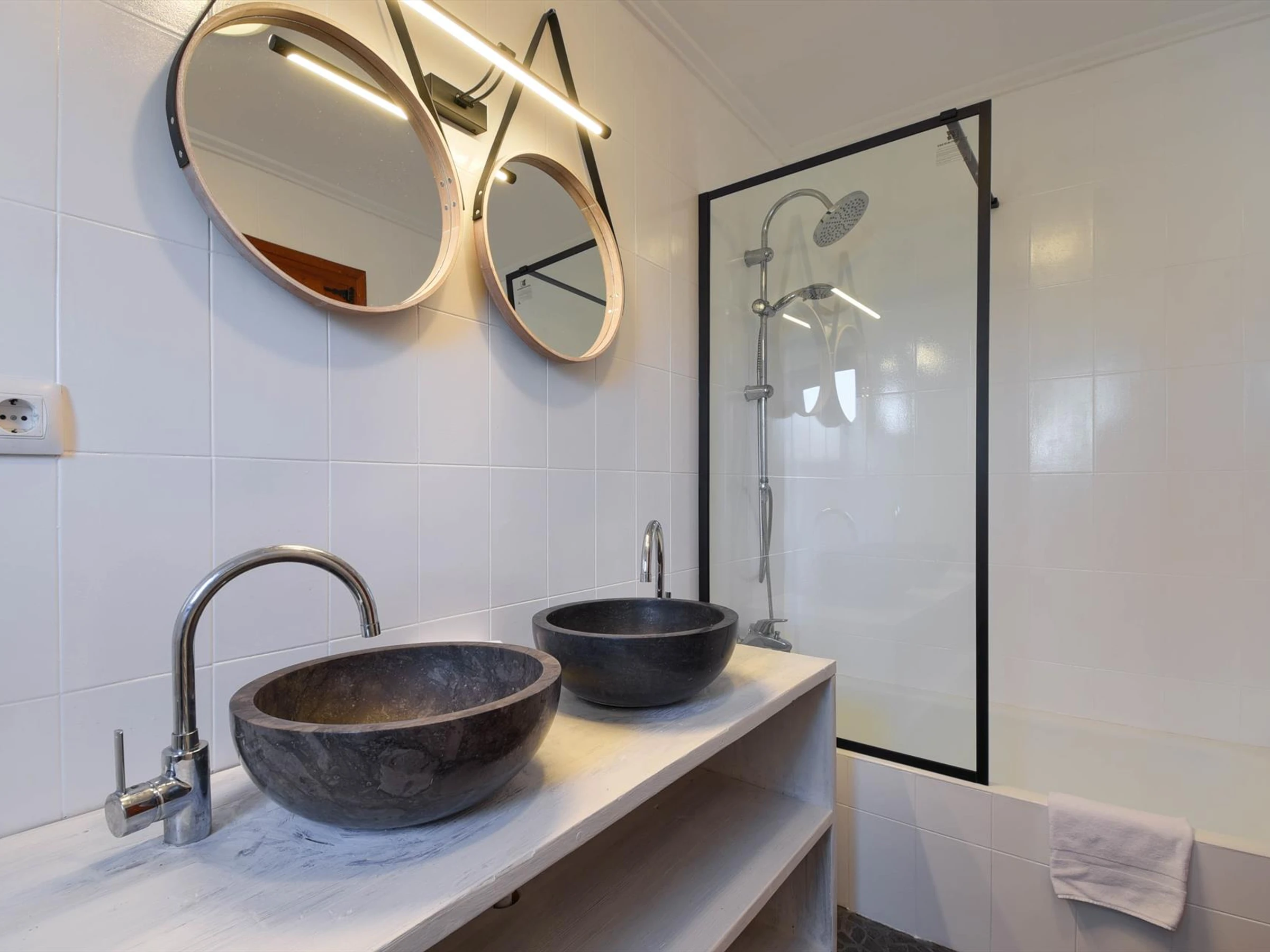 * salle de bain avec double lavabo, douche aménagée dans une baignoire et