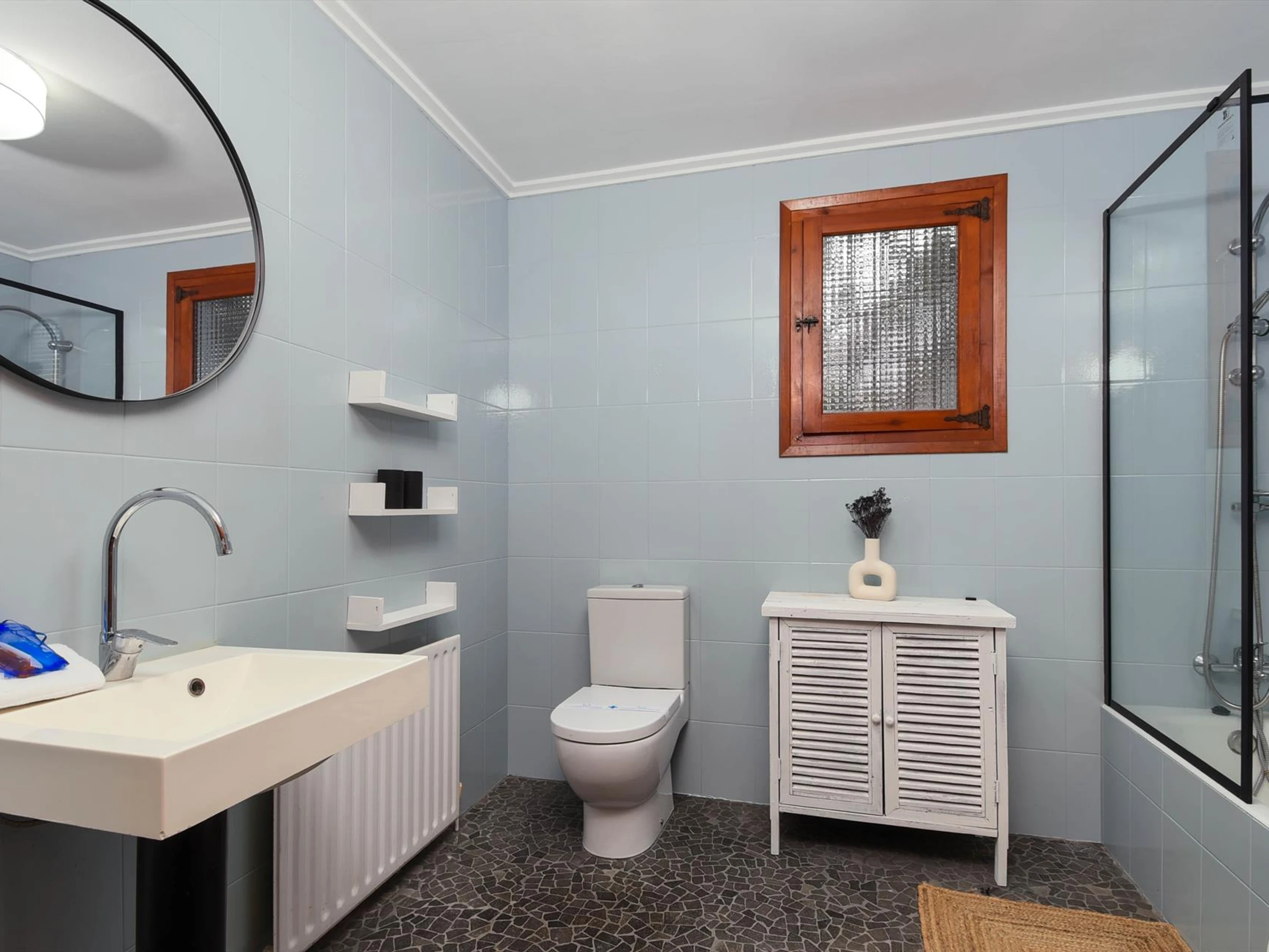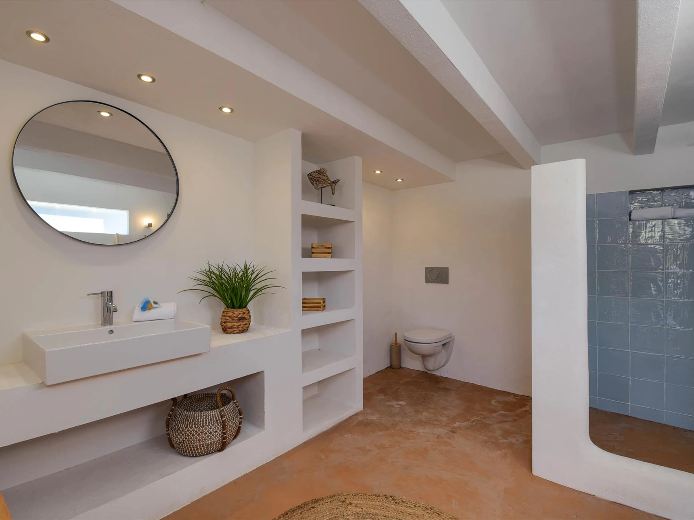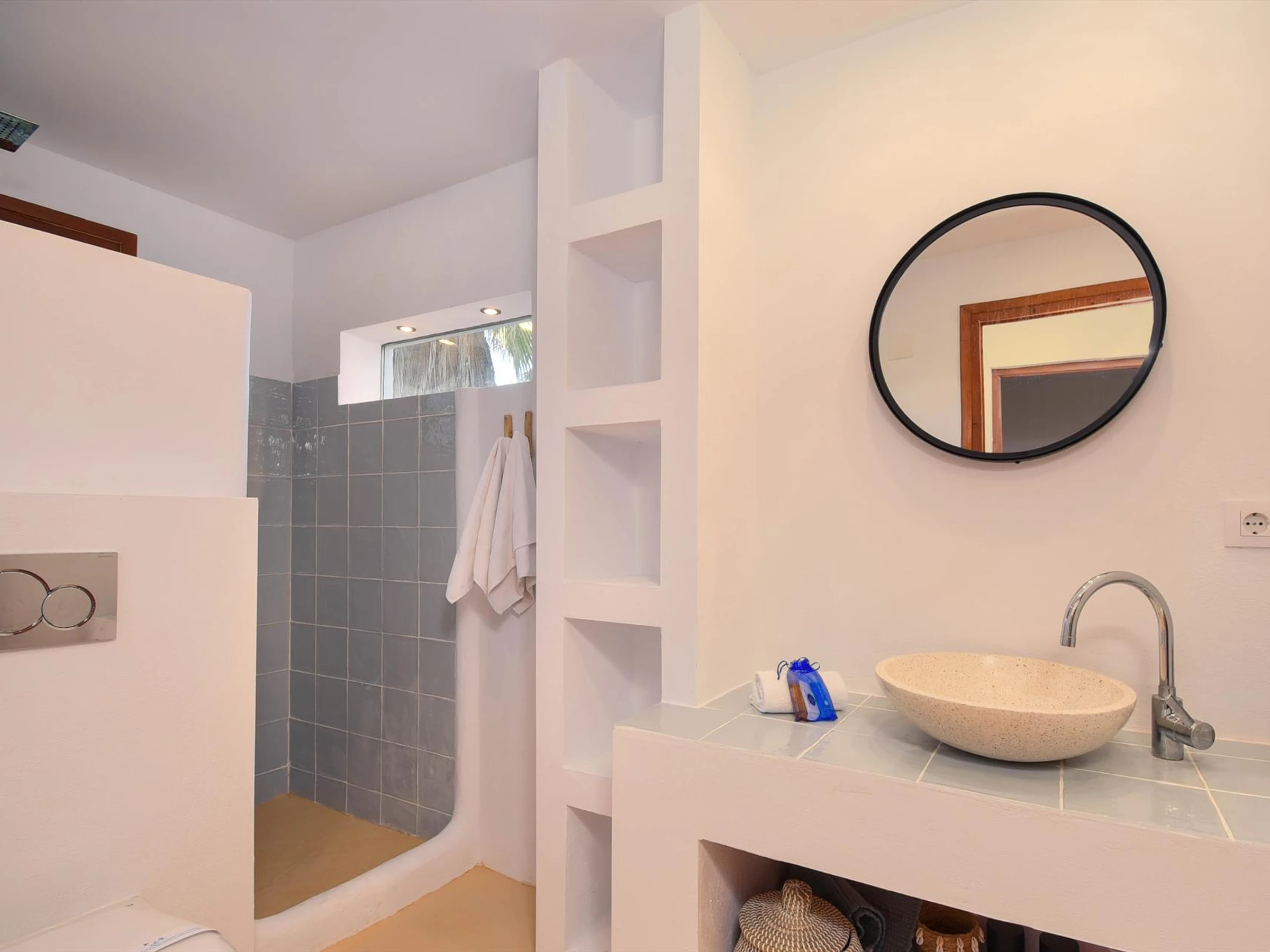 * salle de bain avec lavabo simple, douche et toiletteExtérieur de la villa
