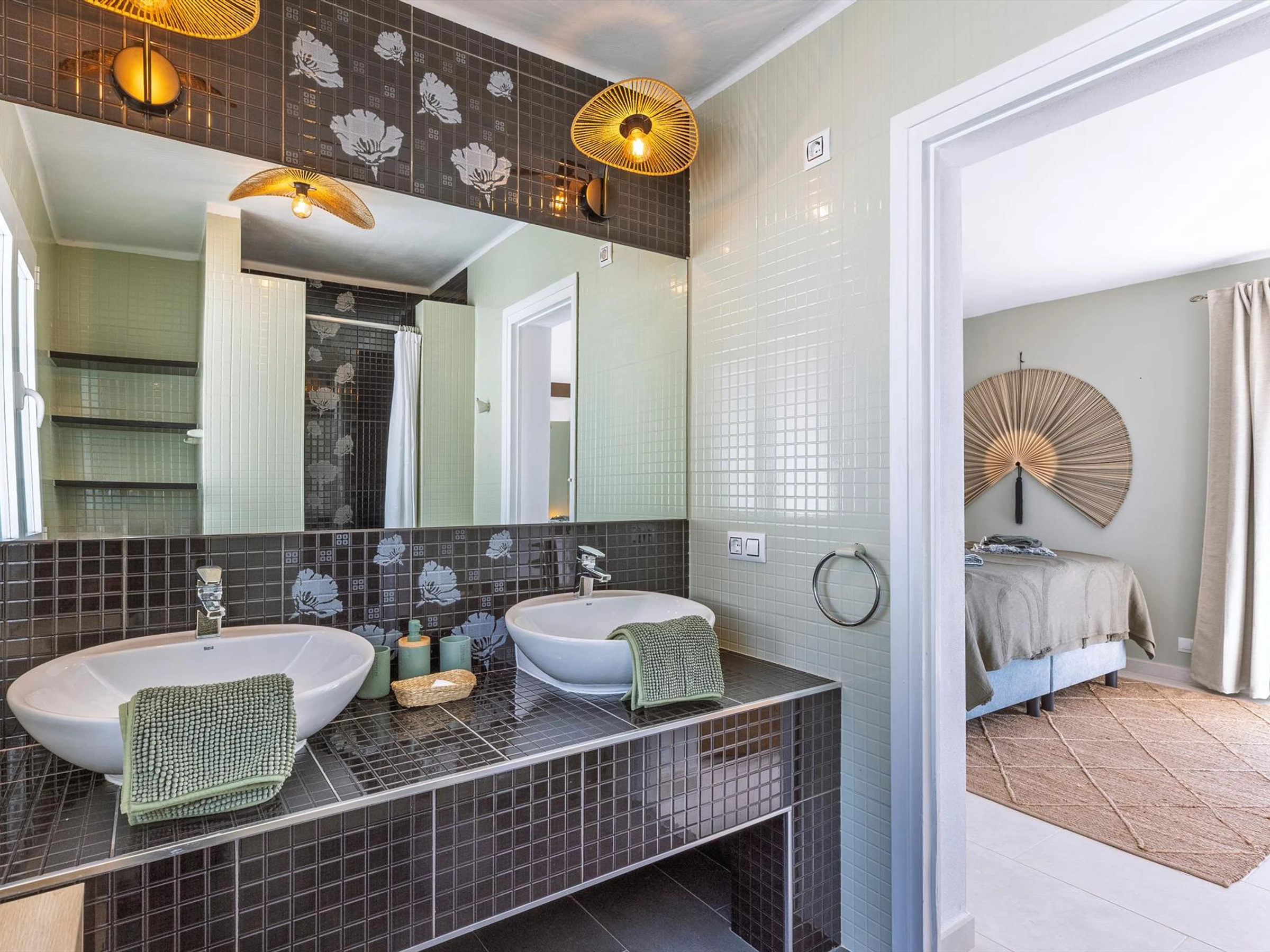 * Grande terrasse avec voile d’ombrage, bar couvert et lit XL