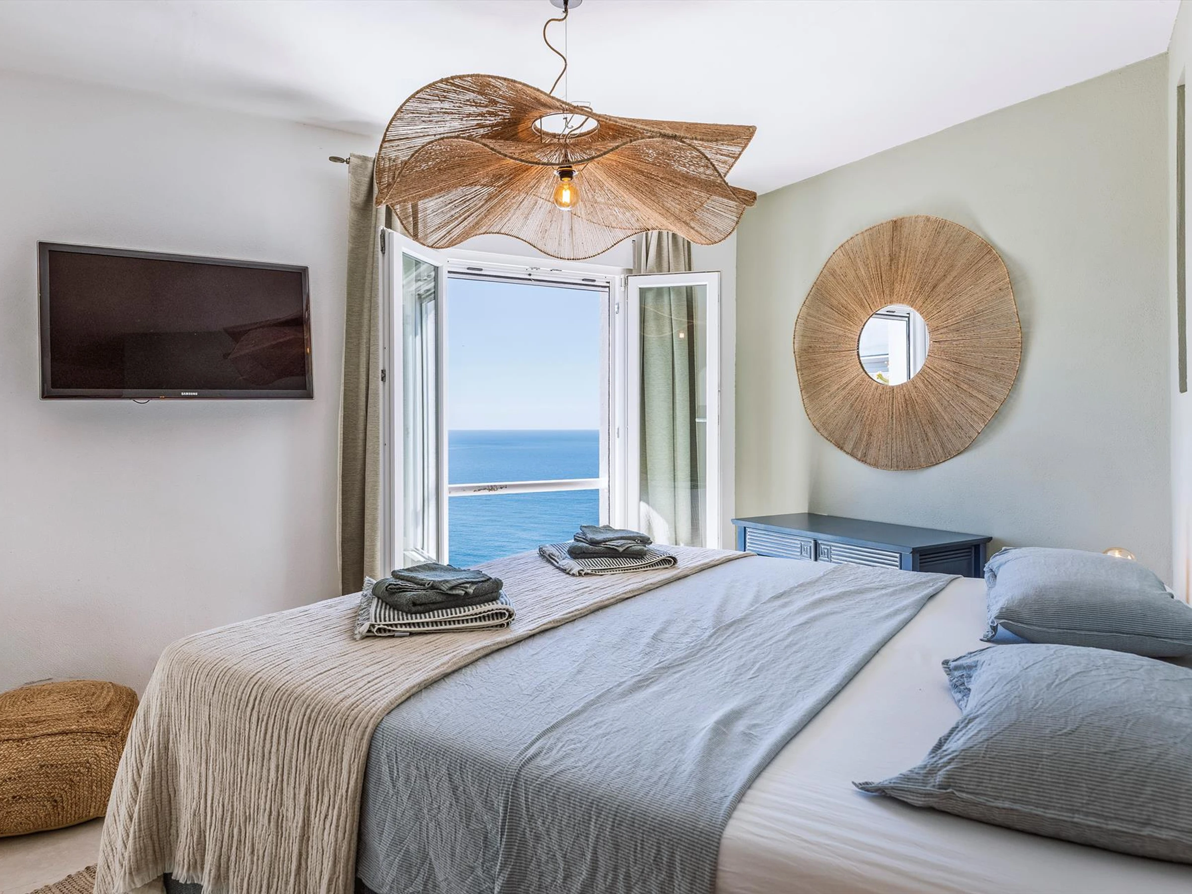 * La chambre principale dispose d’une grande terrasse avec vue mer, table, 2