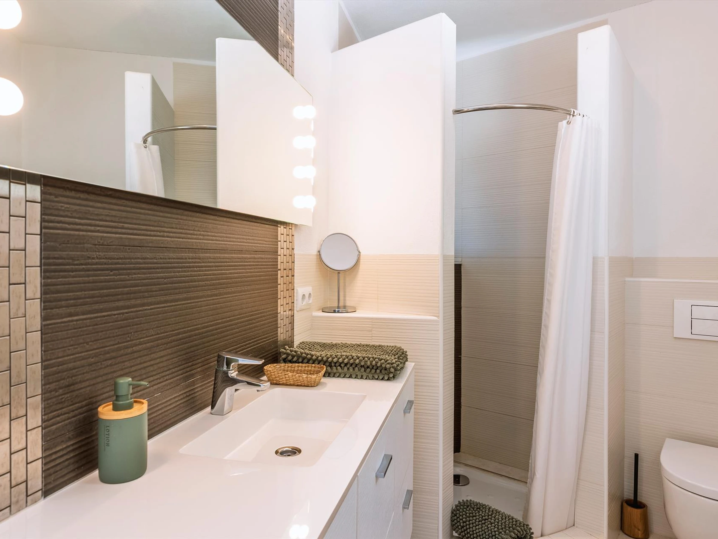 * Douche extérieure, chaises longues, parasols, table à manger, cuisine