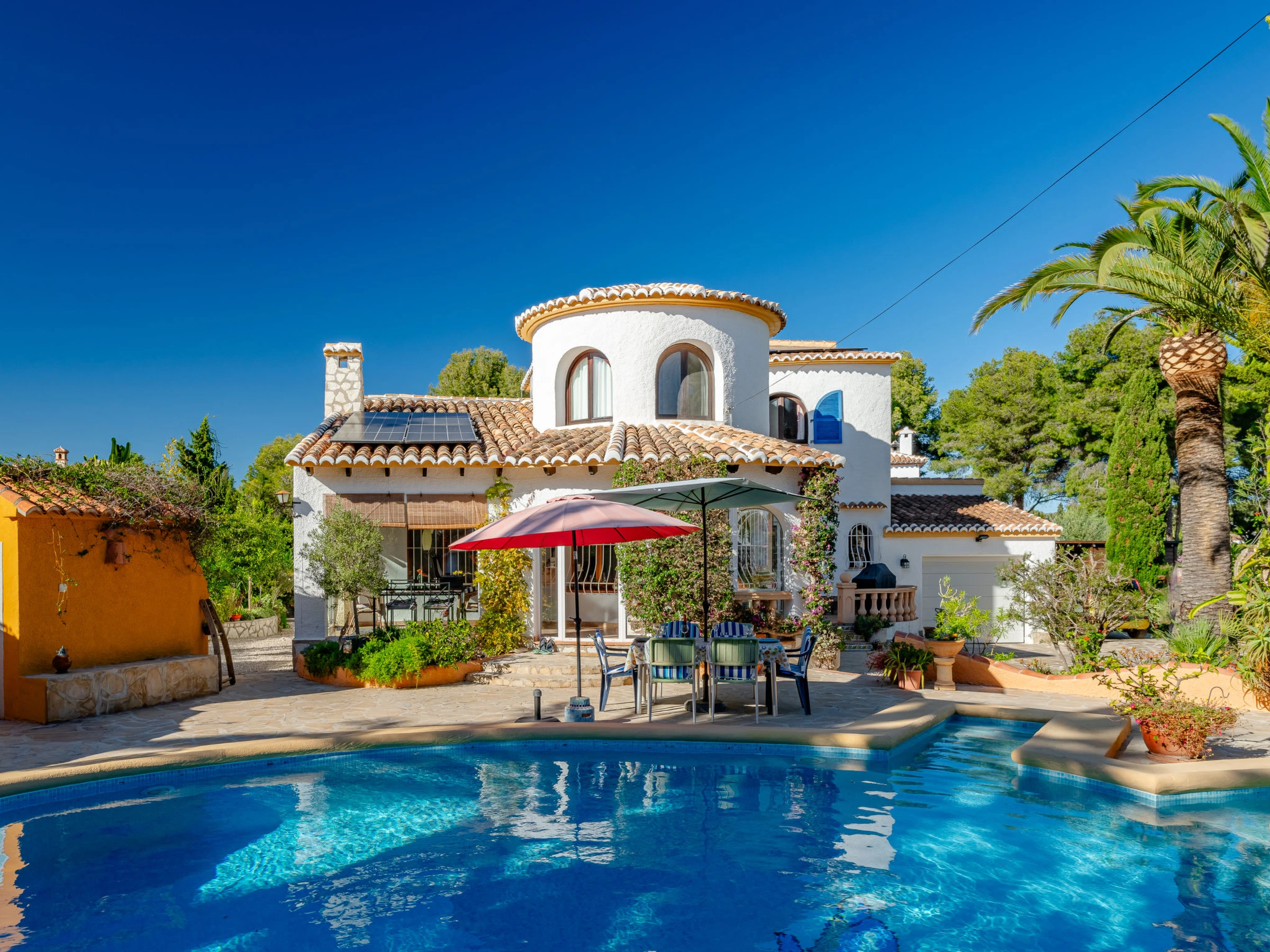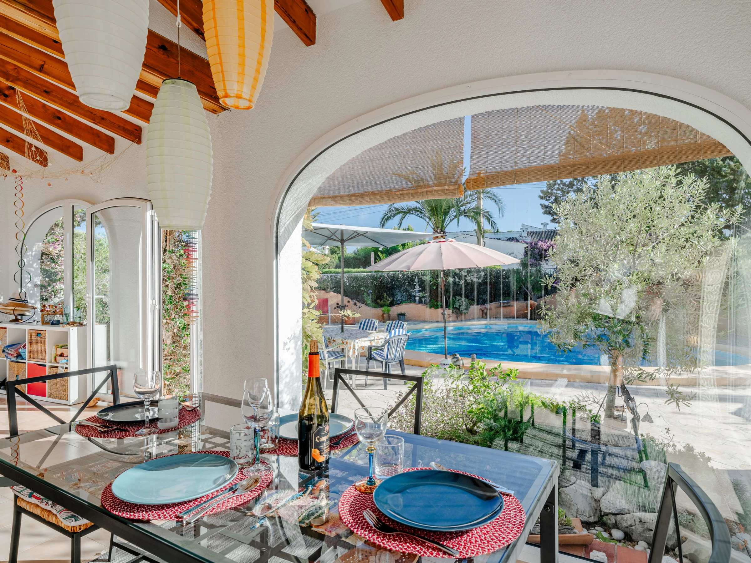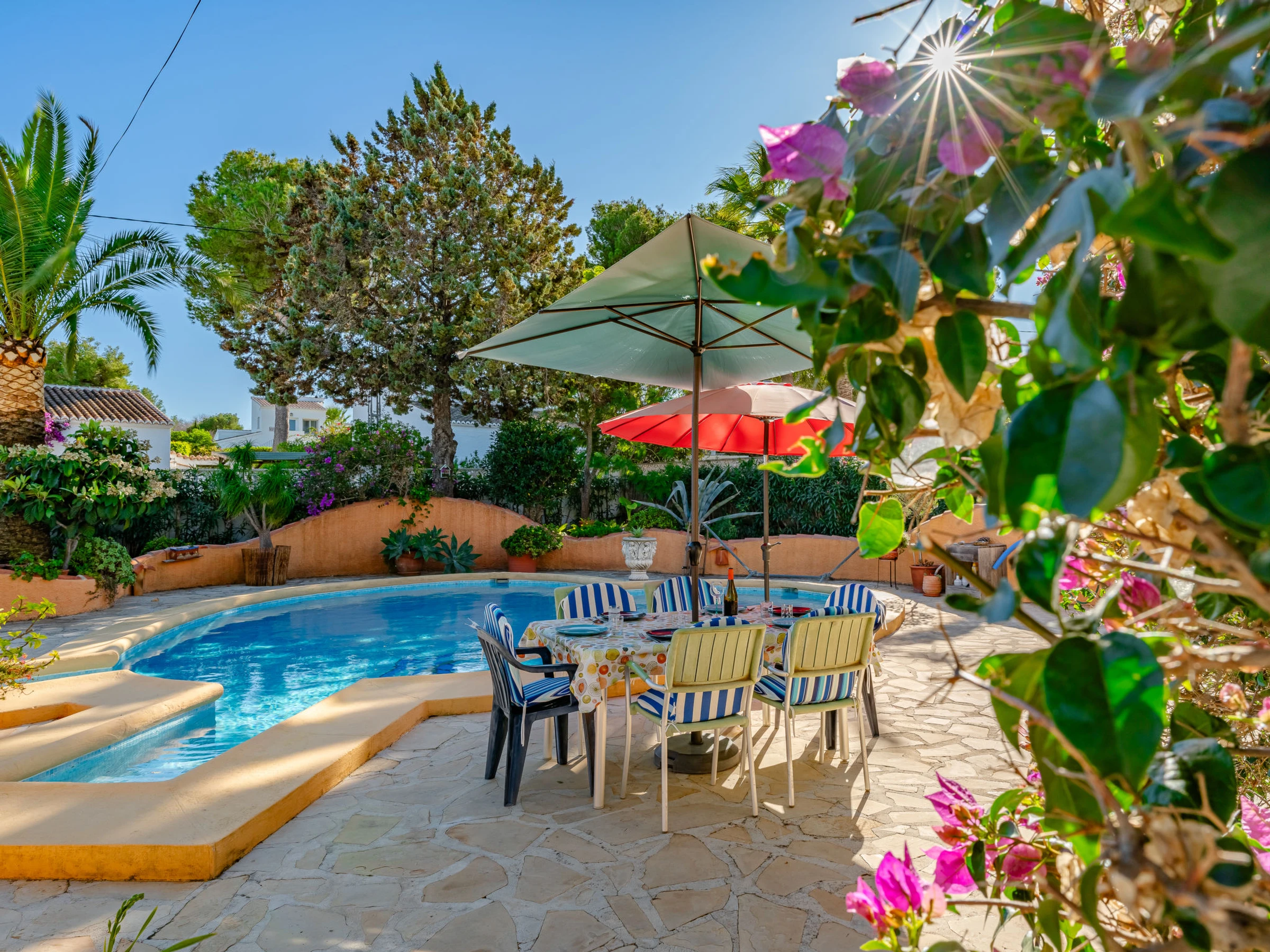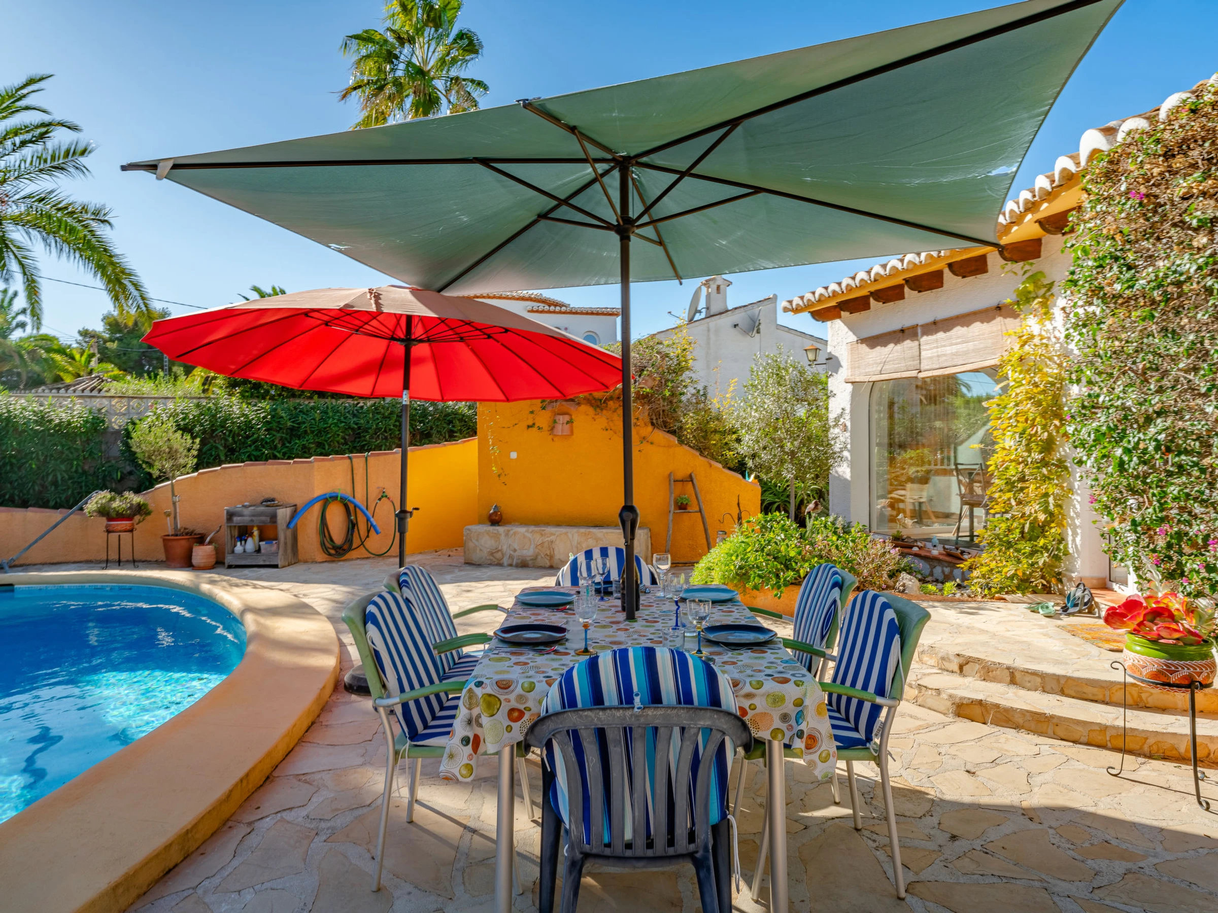 Belle, grande maison confortable "Sol & Sal". Dans le quartier de Costa Nova, dans la localité, à 4.8 km du centre d'Arenal - Javea, situation tranquille, ensoleillée, à 1.8 km de la mer, à 2.7 km de la plage. A usage privé: beau jardin entretenu avec plantes et arbres, piscine (8 x 9 m, profondeur 40 - 210 cm, disponibilité saisonnière: [hidden] - [hidden] avec marches intérieures. Piscine de forme irrégulière. Douche extérieure, meubles de jardin, barbecue, place de parking sur le terrain. Supermarché 3 km, restaurant 350 m, café 1.1 km, arrêt de bus 4.5 km, plage de sable "Arenal" 4.8 km, plage de galets "Portitxol" 2.7 km. Port plaisance 4.8 km, ecole de surf 2.7 km, ecole de voile 4.8 km. Le propriétaire n'accepte pas les groupes de jeunes.