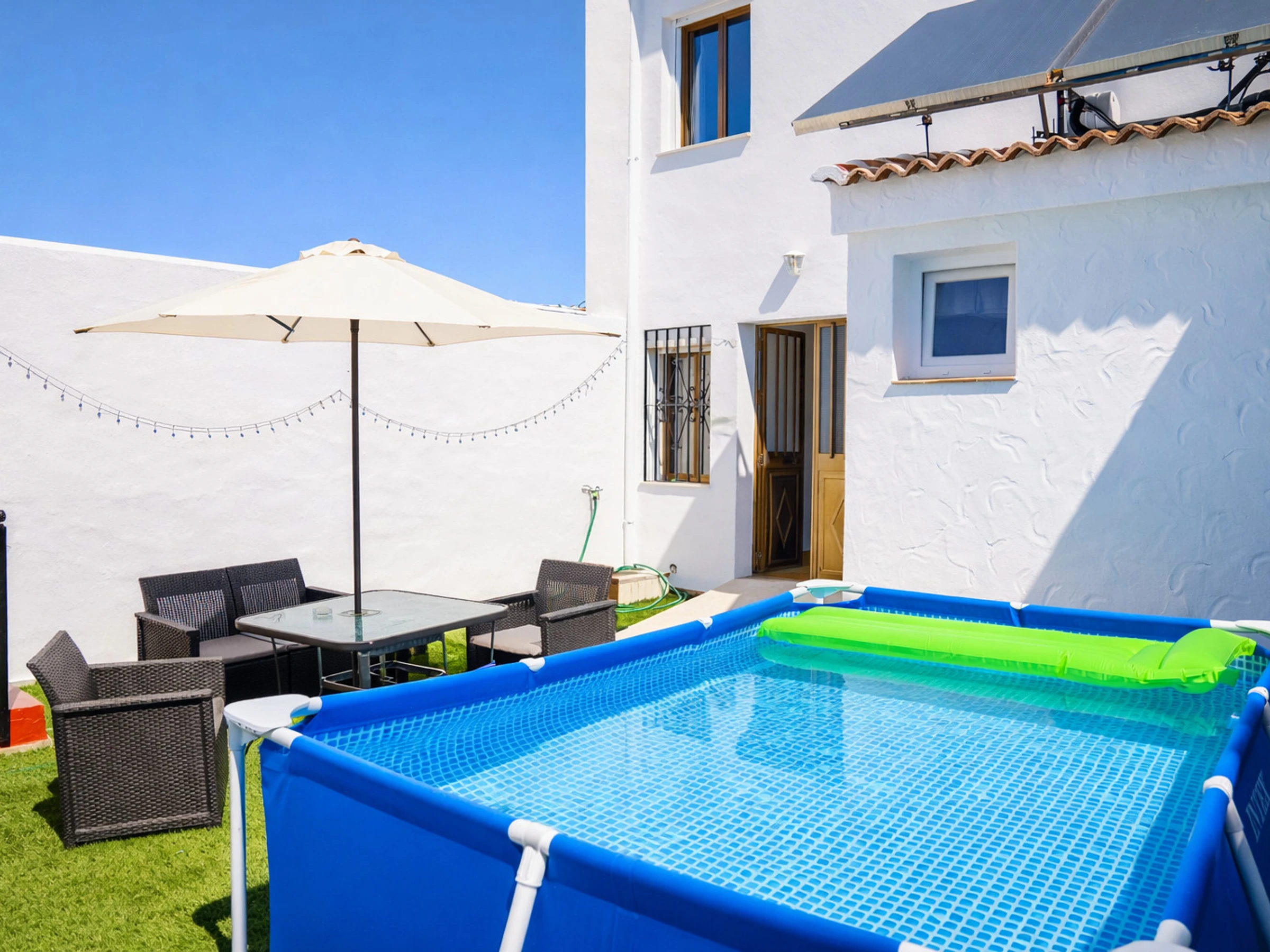 L'extérieur invite à profiter de l'environnement : jardin, terrasse de 20 m² avec mobilier et barbecue au charbon, parfaite pour des réunions en plein air. De plus, elle dispose d'une piscine privée démontable, disponible du 1er juin au 15 septembre, idéale pour se rafraîchir pendant les mois d'été.